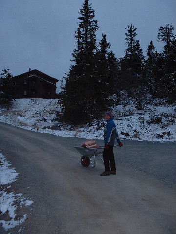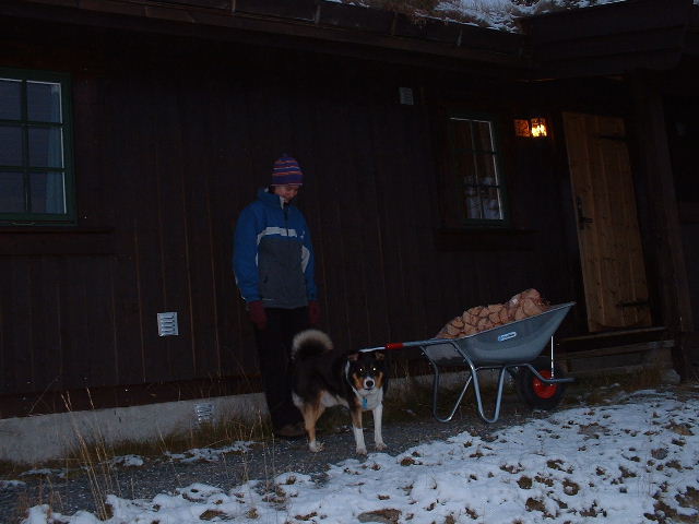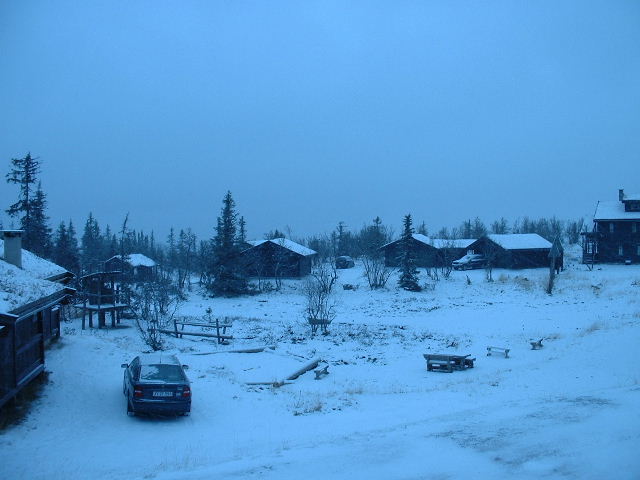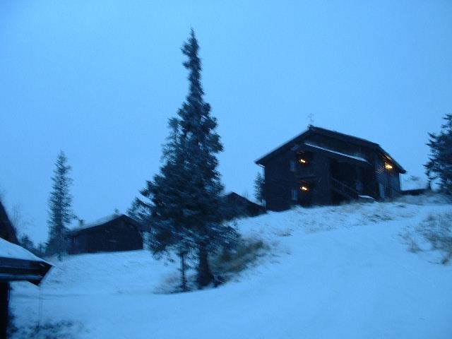 14/10/2002 Hérna eru nokkrar myndir úr ferðinni okkar í Aurdal um helgina. Bærinn Aurdal liggur í fallegum dal um 170 km frá Osló (sjá kort) og á fjallinu fyrir ofan hann er lítið skíðasvæði og sumarhúsabyggð (hytter). Skíðasvæðið er í um 1000 m.y.s. og það snjóaði alla helgina svo við höfðum smá áhyggjur af að komast ekki til baka. Landslagið minnti okkur dálítið á Ísland, en allur trjágróðurinn breytir samt miklu. Aurdal er víst sá staður í Noregi þar sem skógur vex hæst. (English) Below are a few pictures from our trip to Aurdal last weekend. Aurdal is a small village approx. 170 km from Oslo (see map), and on the moutain above there is a nice little skiing area and some cabins (hytter). The cabins are located about 1000 m.a.s. and we had a lot of snow during the weekend. Margrét! sækir eldivið í hjólbörum. Stefán reynir að kveikja upp í kamínunni. Göngutúr um nágrennið, gengum á fjallið Fjellenden í blíðskaparveðri á laugardag. Það snjóaði heilmikið á sunnudag. Takið eftir jólatrénu á myndinni hér að neðan, það virðist hálf þreytt á allri snjókomunni. Myndir af fjallaþorpinu í ljósaskiptunum á sunnudag. Fleiri myndir úr ljósaskiptunum. Á leiðinni heim, síðasta myndin er tekin í Aurdal þorpinu. Skódinn stóð sig frábærlega, en við keyptum nú samt keðjur til öryggis :-) |